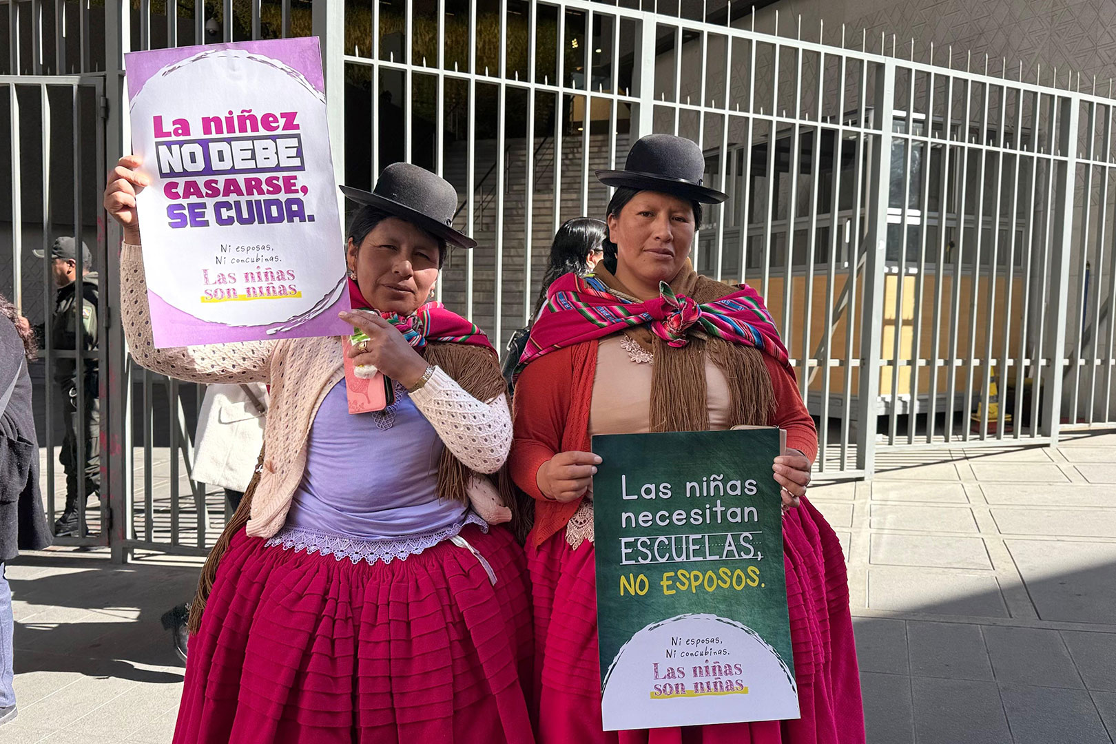 Ipas staff and partners stood in support of the ban on child marriage during the September session of Bolivia’s parliament where the law change was debated. They held signs with messaging from a nationwide advocacy campaign: Ni esposas, ni concubinas. Las niñas son niñas. (Neither wives nor concubines. Girls are girls). © Ipas Bolivia